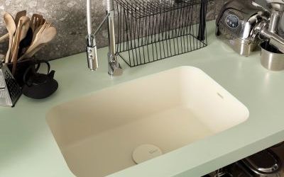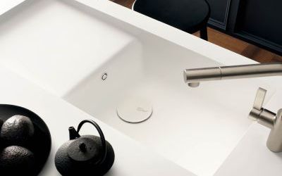 建築師 Jean-Jacques Marvielle 對結果感到滿意,“我們找到了一款新穎獨特的產品:可麗耐®相當耐用,非常適合廚房使用。檯面和桌邊更是印證了它的特質。這種材料的強度、可製成圓弧的可塑性、無縫接合的特性、均勻的色彩以及藝術創作的無限可能,所有這些特質都能吸引人們選用這種材料。‘水’和‘火’這兩個功能獨立的區域相對而立。中央的桌面將這兩處多彩的區域銜接在一起,與灰色的櫥櫃相得益彰。”